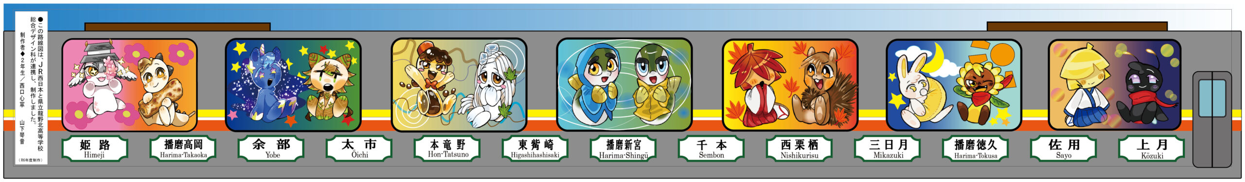 姫新線の利用促進のため、兵庫県立龍野北高等学校総合デザイン科の生徒がJR姫新線車内に掲示する路線図19種類をデザインしました。