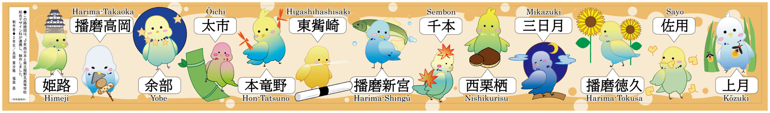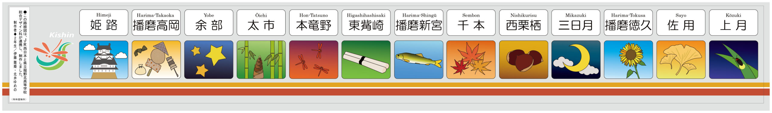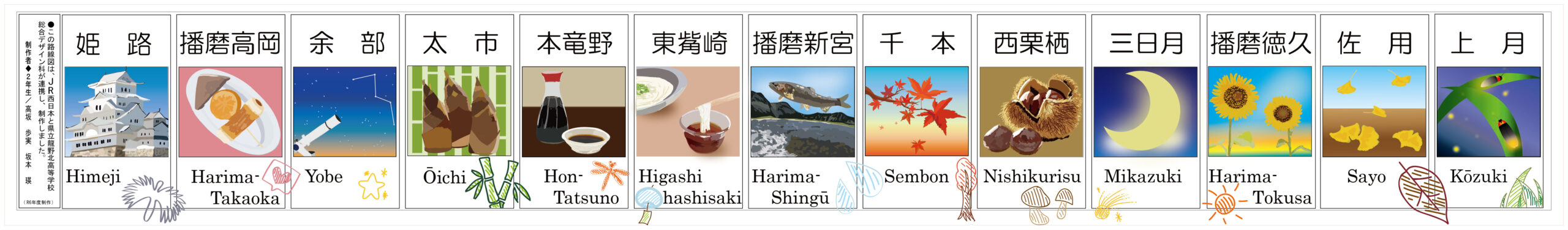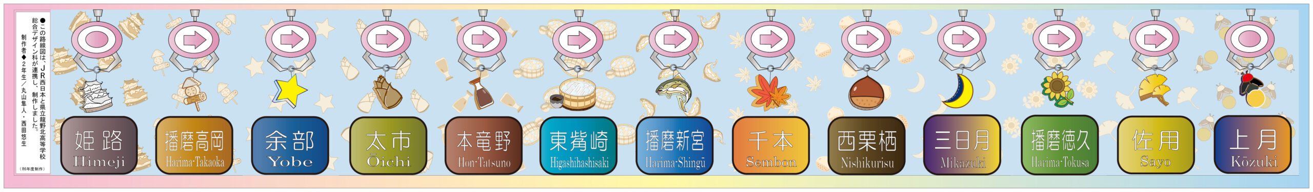 姫新線の利用促進のため、兵庫県立龍野北高等学校総合デザイン科の生徒がJR姫新線車内に掲示する路線図19種類をデザインしました。